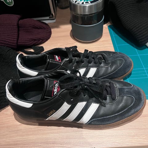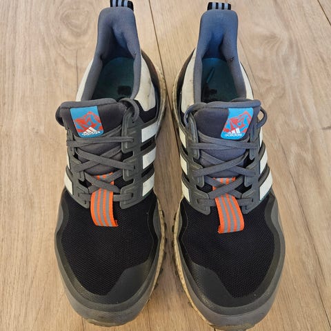 Adidas NMD sneakers joggesko i størrelse 41. Skoene er svarte med detaljer i blått og rødt. Materialet er tekstil med en fleksibel og pustende overdel. Sålene har godt grep og demping, egnet for hverdagsbruk.
