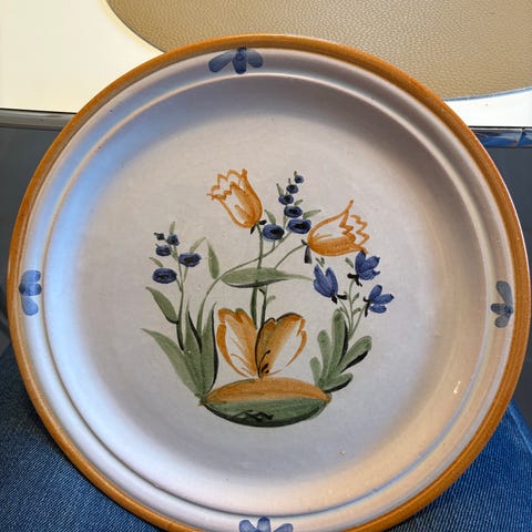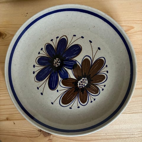 Dette er en "Primavera"-tallerken fra Rörstrand, designet av Gertrud Lönegren.