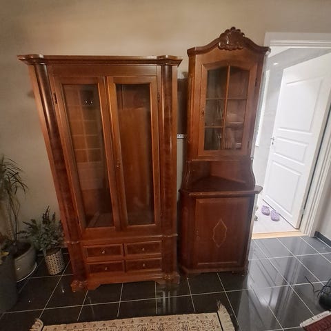 Pent vitrineskap fra Ellos. Sort med gulldetaljer. Kan hentes i Askim og hjelpes å bære til bil. Må hentes ferdig montert.