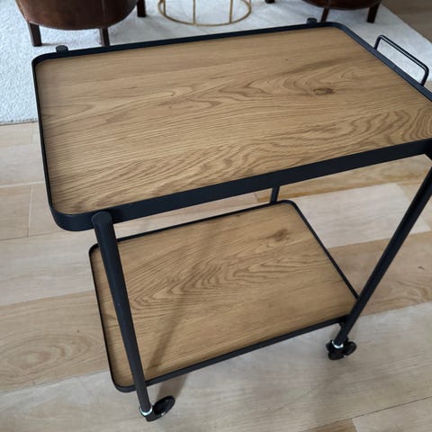 Gammelt fint trillebord i string. fra 50-60tallet . Det er helt og pent uten spesiele merker. Det er tidskriftsholder under.