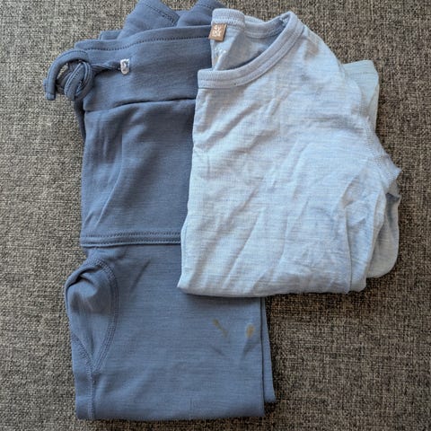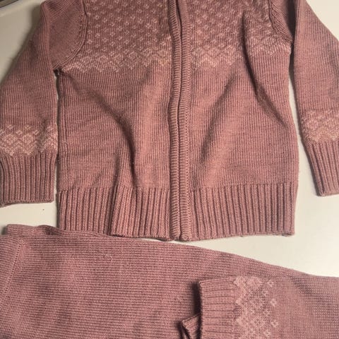 1 genser er hjemmestrikk, kjolen er hjemmestrikk. 2 gensere fra reflex i type 70 % merino ull og 30% akryl. Veldig deilige gensere å ha under jakke eller dress.