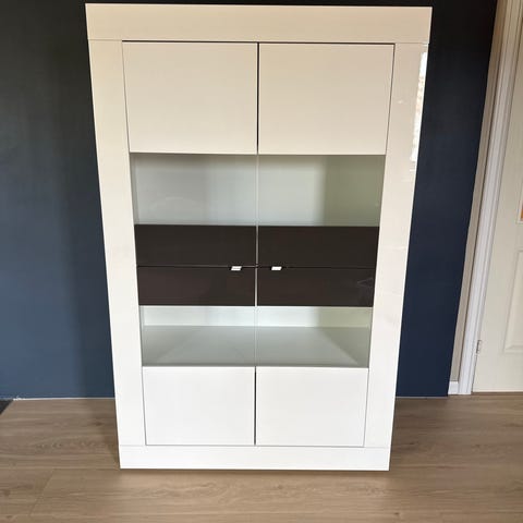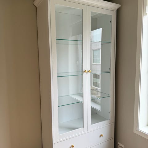 Pent brukt skap med to skuffer, glass hyller, glass i dørene og på sidene. Ikke boret eller montert noe lys i skapet, men det er også en mulighet å få gjort.