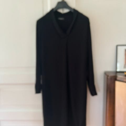 Eksklusiv kjole fra Joaeph i 100% merinoull i svart farge, størrelse S. Kjolen har lange ermer og rett fasong, rekker ril under knærne.