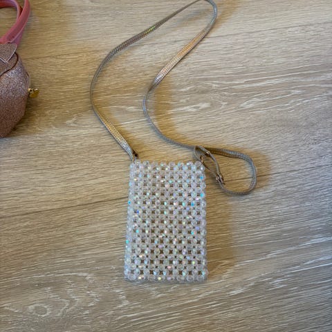 Lita selskapsveske i glitrende steiner, med lang skulderreim i gullfarge. Ikke brukt. 10 x 15 cm.