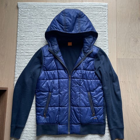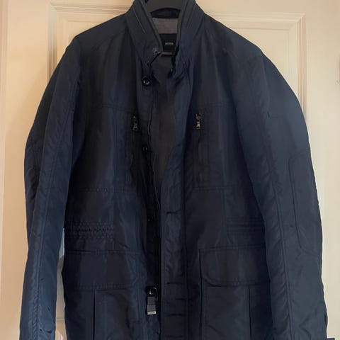 Hugo Boss Jakke i blå farge, størrelse L for herre. Jakken har flere lommer, inkludert innerlomme med glidelås. Materialet er lett og egnet for utendørs bruk. Jakken har glidelås foran og en enkel, funksjonell design.