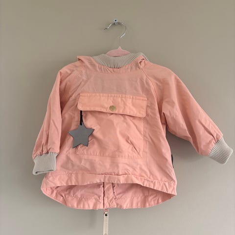 H&M anorakk jakke i hvit farge, størrelse 98, designet for barn i unisex-stil. Jakken har hette og glidelåslukking på siden, samt en frontlomme med klaff. Passer til bruk som ytterplagg ved kjøligere vær.