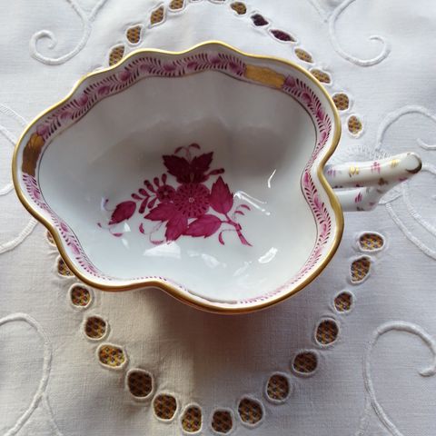 Samleobjekt fra Herrend. Porselen vase med hvit farge og dekorative blomster. Vasen har et unikt håndtak med detaljer og gullfargede aksenter. Høyde ca. 30 cm. Egnet som dekorativ gjenstand i hjemmet.