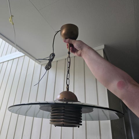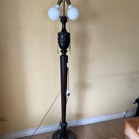 Nederste dele av pinnen bærer preg av å ha stått i jord i mange år, men foruten det er lampen i meget god stand, både emaljen på selve fluesoppen og alt annet.