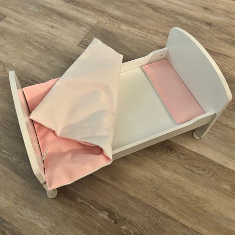 🛏️ Sjarmerende dukkevugge i Tre med Dukke og Kosebamse – Perfekt til Rollelek! 🧸