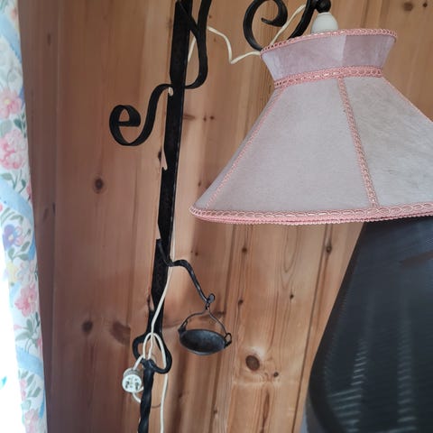Klassisk flotte smijernsbelysning. En stor gulvlampe og to mindre vegglamper i samme stil med matchende lampeskjermer