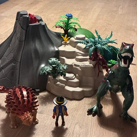 Veldig pent lekt med sett med 2 dinosaurer t-rex og velociraptor og en bil som kan kjøre selv om den dyttes bakover først. Knapt lekt med. Fra Playmobil.