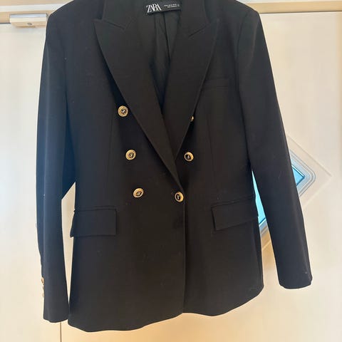 Zara blazer i svart farge, størrelse S for kvinner. Blazeren har dobbelspent design med gullfargede knapper foran og på ermene. Materialet og passformen er tilpasset damebruk.
