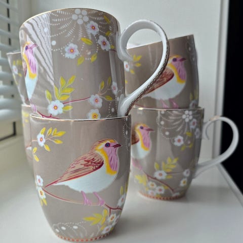 Krus med flamingo- og botanisk design i keramikk. Leveres i dekorativ rund gaveeske med blå bånd. Passer til varme drikker og som gave.