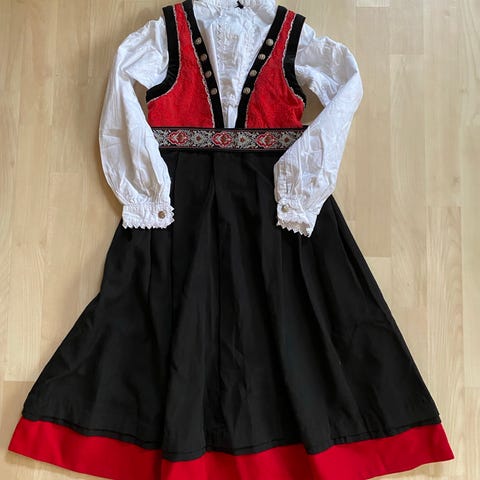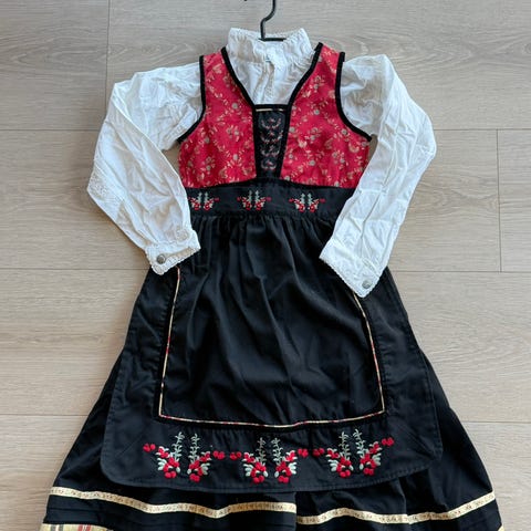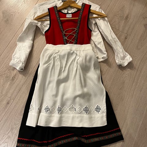 Festdrakt med skjorte, kyse og forkle selges. Strl 110. Pent brukt.