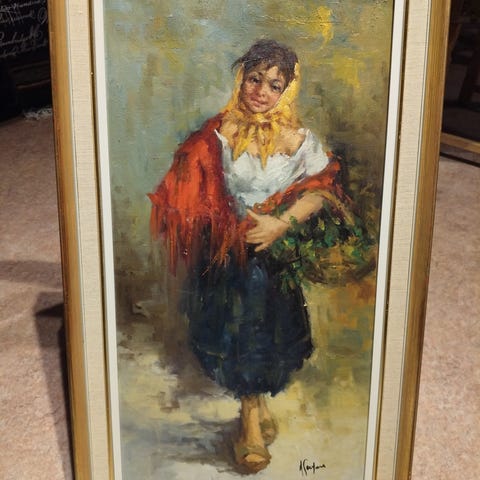 Maleri av kvinne i profil med rødt skjerf og kjole, 50x61cm