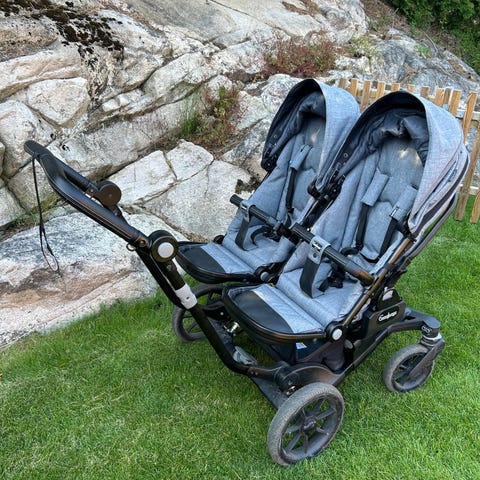 Emmaljunga tvillingvogn / søskenvogn med blå bagdeler og svarte sportsdeler.