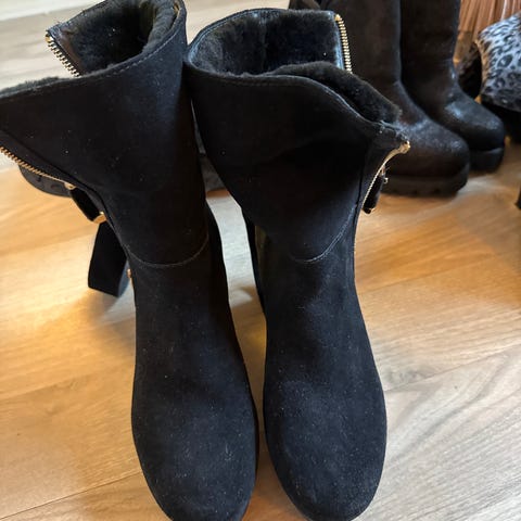 Bianco støvler i størrelse 37 for dame. Laget av svart semsket skinn med frynser som dekorative detaljer. Hælhøyde og spiss tåform. Laget i Italia.