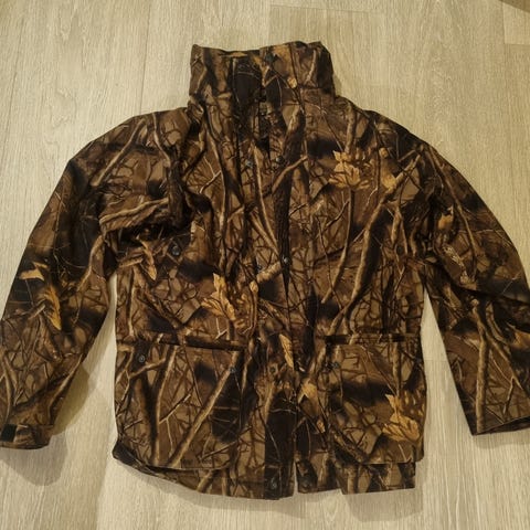Mil-Tec jakke i kamuflasjemønster, størrelse S. Jakken har hette og glidelås, egnet for utendørs bruk. Materialet er slitesterkt og designet for å gi kamuflasjeeffekt.