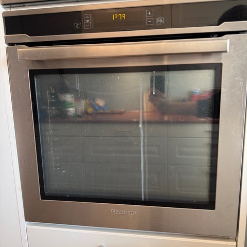 Frittstående kjøkkenhette i børstet stål og glass, komplett med avtrekksvifte. Avtrekksvifte har tre nivåer og var effektiv og relativt stillegående. Mål på hetten er cirka 92 x64 cm. Hetten har 4 innebygde lys, hvorav glasset på den ene mangler. Alt fungerte før demontering, som ble utført av elektrikker. Den ble byttet fordi vi ønsket en takmontert avtrekksvifte.