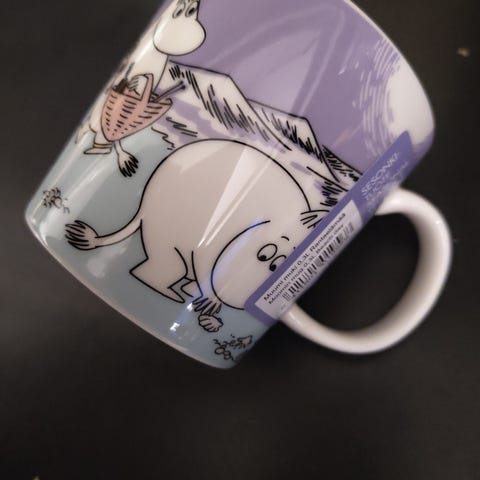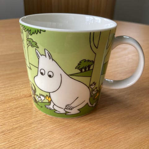 Mummikopp i gul keramikk. Kopp med motiv av Mummitrollet og tekst. Passer til servering av varme drikker. (Slutsåld)