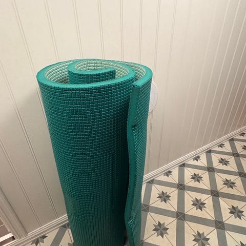 Ukjent yogamatte i blå farge. Matten er sammenleggbar og laget av et materiale som gir demping og støtte under trening eller yogaøvelser.