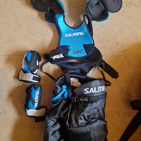 Salming ishockey beskyttelsesutstyr bestående av albuebeskyttere, kne/leggbeskyttere og bukser. Utstyret er designet for ishockey og gir beskyttelse under sporten. Fargene er svart og blå med hvite detaljer. Materialet er slitesterkt og tilpasset for å gi komfort og beskyttelse under spill.