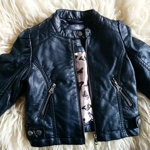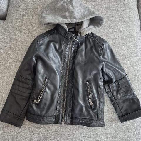 Faux skinnjakke (ikke ekte skinn) med hette for barn i størrelse 98. Jakken er svart og har en quiltet fôring på innsiden. Hette er i grått stoff, festet til jakken. Jakken har glidelås foran, to brystlommer med glidelås og to knappelommer. Passer for gutt.