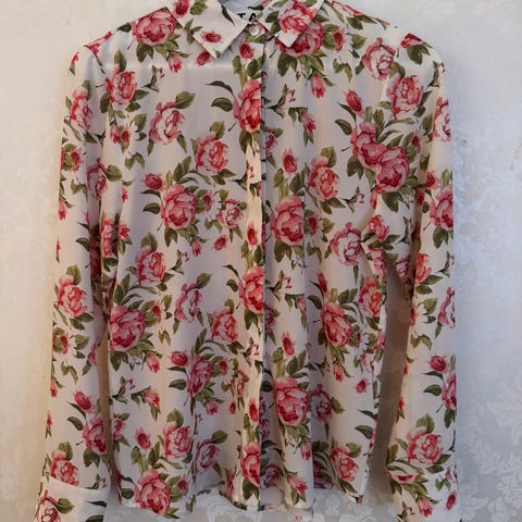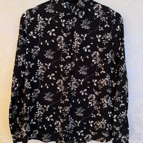 Blusen har knyting i livet og mange knapper på ermene, som gir den en rocka look. Tynt og svalt stoff.