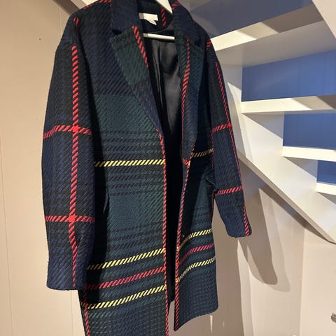 Annet yttertøy i blått med rutemønster i rødt, størrelse S. Jakken har doble knapper med dekorative detaljer og er foret på innsiden. Passer til kvinner.og andre ting 200,- pr stk bare zara ull kåpe 300,-