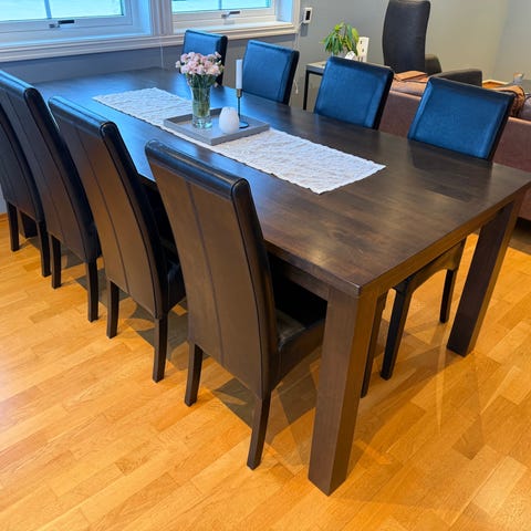 Stort lekkert og robust salongbord i heltre (ask) i meget god stand selges rimelig. Bordet er 180 cm langt med et tillegg på 45 som klaffes på. Plass til 8 personer. Merke Pedro. Selges grunnet nytt bosted med liten grunnflate.