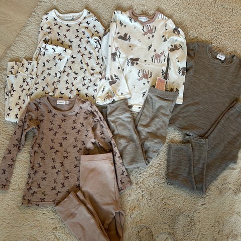 Klærne er brukt av ett barn i en sesong. Noe slitasje og hull, men kan fint brukes. Den ene overdelen har en liten flekk foran, mulig den kan vaskes bort.