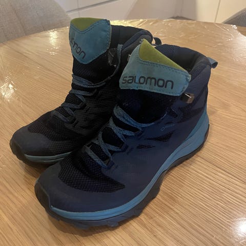 Salomon fjellsko i størrelse 44, blå farge. Skoene er designet for fotturer og har Contagrip yttersåle for godt grep på ulike underlag. Obs, de mangler såle. Jeg antar de er brukt et sted mellom 10 og 20 km. Selges da jeg har anskaffet spesialsåler etter at jeg kjøpte de og da ble skoene for små. Hentes på Løren i Oslo eller sendes