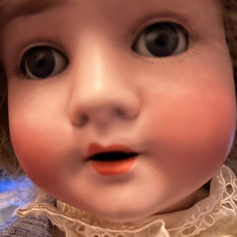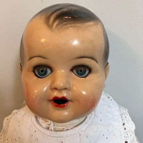 Vintage dukke med blondt hår, iført blå kjole med hvit krage og perlekjede. Dukken har røde bånd i håret og lange hvite strømper. Kroppen er i tekstil