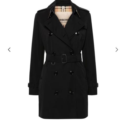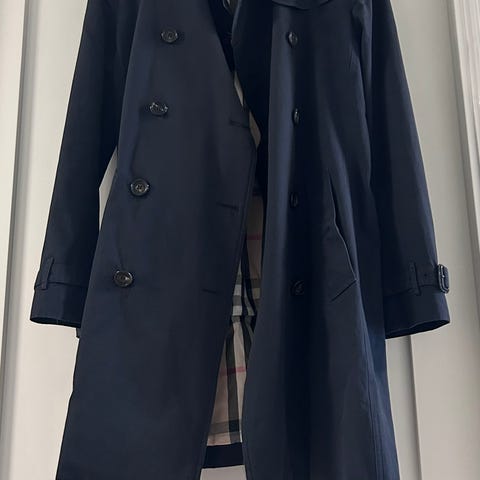 Burberry Trench coat i svart farge, dame størrelse 36. Plagget har dobbelspent knappestolpe og klassisk design.