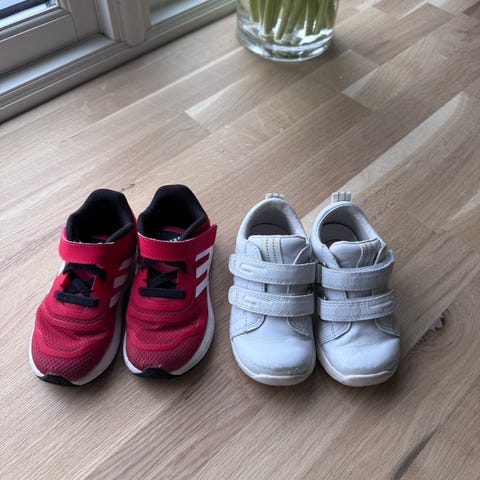 Adidas barnesko for jenter i størrelse 26. Ett par i rød farge med borrelås og ett par i svart farge med snøring. Skoene er laget i materialer egnet for barn.