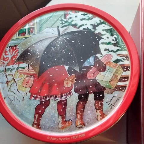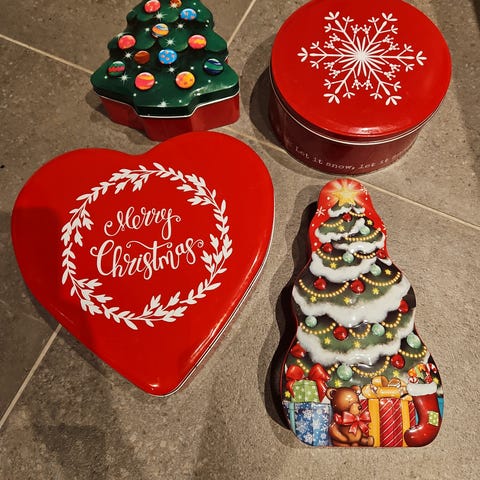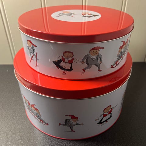 2 stk jule-kakebokser selges. Den ene er litt større enn den andre. Mål på den største; H: 10 cm. Ø: 25,5 cm. Mål på den mindre; H: 9,5 cm. Ø: 23 cm. Må hentes, sender ikke.