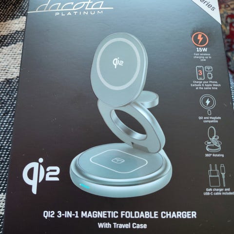 Dacota Qi2 3-i-1 magnetisk foldbar lader med reiseveske. Laderen har en effekt på 15W, støtter trådløs lading for opptil tre enheter samtidig, og har 360 graders rotasjon. Kan brukes samtidig til iphone med MagSafe (dvs iphone 12 og oppover), Apple watch og Airpods.