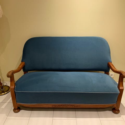 Sofa etter renovering, fjærer, svamp, møbeltrekk er nye, på små hjul.