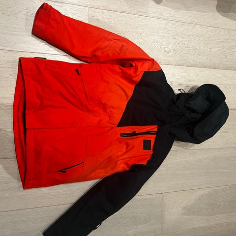 Jakken har rød, blå og hvit fargekombinasjon med snøkrystallmønster på ermene. Materialet er teknisk og egnet for skigåing. Jakken har glidelåslommer foran og en høy krage for ekstra beskyttelse.