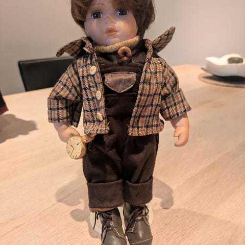 En nydelig Porselensdukke med korketrekker, klar for en skøytetur. Dukken er ca.36cm høy. Den har kun stått til pynt på et stativ.