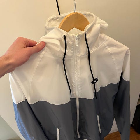 Helly Hansen regnjakke i størrelse S, farge hvit. Jakken har hette og glidelås, egnet for utendørs bruk.