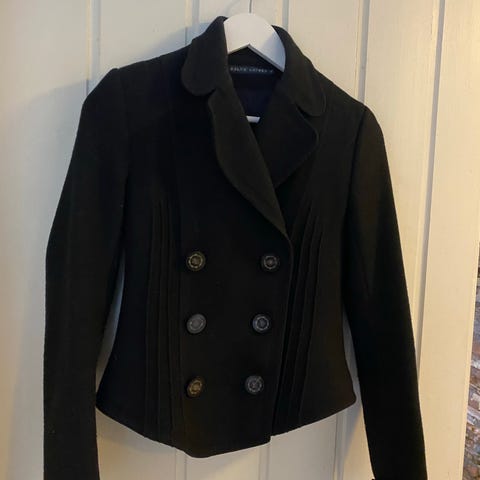 Zara Woman Blazer i størrelse S, farge svart. Yttermateriale i 100% polyester og fôr i 100% viskose. Jakken har et dekorativt mønster på innsiden og sitter pent på.