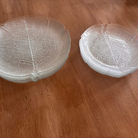 Vintage Arcoroc Aspen Leaf glassfat. Fra 1980-tallet. Klart, herdet glass med et preget bladmønster. Made in France. Pent brukt og I god stand. Noe bruksmerker kan forekomme.