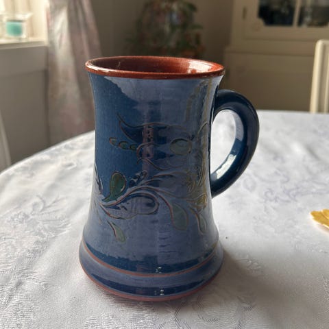 1 stk. Vintage / Retro krus fra Abbednæs Potteri. I keramikk. Blå og brune jordfarger som er glasert. Med inngravert tekst;