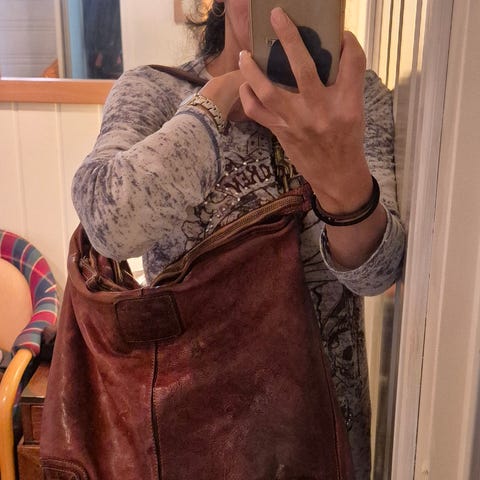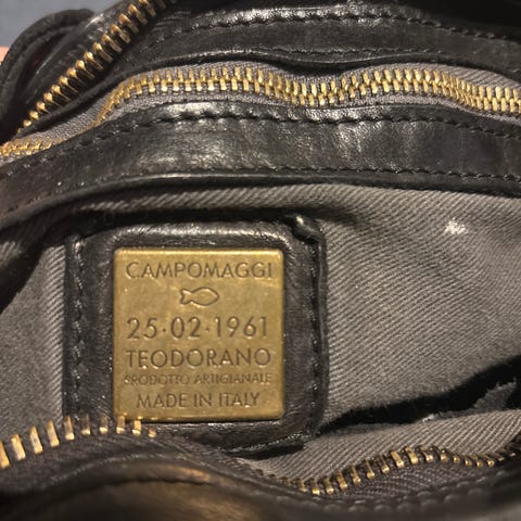 Veska er helt spesiell og veldig romslig! Tre rom, to store og en mindre med glidelås. Kan brukes crossover. Pga flekkene inni og at den er sydd litt inni pga hull i glidelåslommen, selges den til en meget gunstig pris. Den er ca 30 cm høy og ca 43 på det bredeste, renna er regulerbar og i samme skinn og farge som veska ellers.