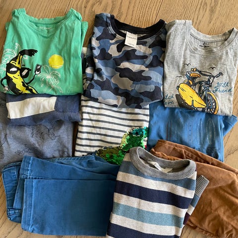 Klespakke for gutt i strl 128/134 selges. Noen av plaggene er også i strl 140, men har vært brukt av gutt på 9-10 år. Plaggene er i god stand, men den grå genseren har noen flekker, se bilde. Den hvite Lego-t-skjorten har også et lite hull på rygge. Den beige shortsen mangler en knapp i livet.