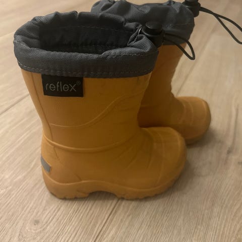 Reflex barnestøvler i størrelse 35 for unisex. Støvlene er oransje med svart overdel og har en gummisåle med godt mønster for grep. Materialet er vanntett og egnet for utendørs bruk i vått vær. Støvlene har en strammesnor øverst for bedre passform.