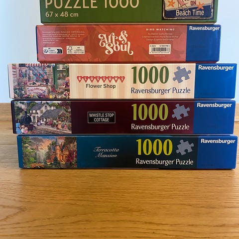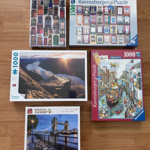 Ravensburger puzzle krypt inneholder et bilde/tegning for å se hvor brikkene skal. Puzzle scandic pattern inneholder to postkort. Og live puslespillet er et rundt puslespill med et fint fuglemotiv (inneholder bilde)