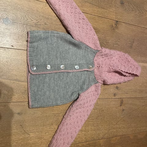 Next barnekofte/ cardigan i flerfarget garn, størrelse 92, til jente. Strikket materiale med hette, 2 lommer og tre knapper foran. Passer for barn i alderen 1½-2 år. Deilig å myk å ha på seg!