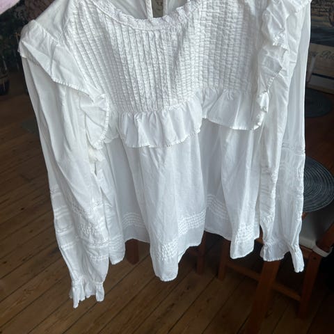 DAY Birger et Mikkelsen bluse i hvit farge, størrelse 36. Blusen har lange ermer og detaljer med broderi og struktur i stoffet. Stor i str, aldri brukt.